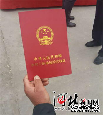 4月19日,在衡水市冀州区召开的河北省农村经营管理工作会议暨农村承包地确权登记颁证现场会上,衡水市冀州区庄子头村208户村民拿到了冀州区,同时也是河北省首批新版土地承包经