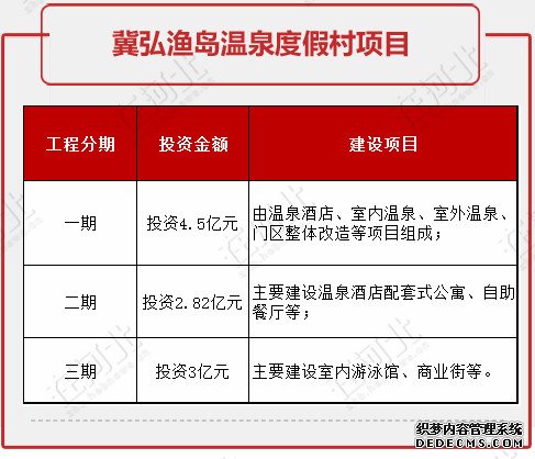 该项目主要建设以滑雪运动为主题的四季旅游休闲度假地,构建世界水准的国内顶级滑雪度假区,主滑雪场规划雪道31条,雪道总长度30公里,雪场最大容纳量1万人。滑雪度假区距首都机场130公里,西距金山岭长城10公里,东距承德60公里,从北京市区到滑雪度假区仅需一个半小时车程。2016年,部分雪道建设完成,初步具备接待能力。 秦皇岛市渔岛温泉度假村:全面升级改造 总投资超10亿元的冀弘渔岛温泉度假村项目,2014年在北戴河新区渔岛景区正式破土动工。 冀弘渔岛温泉度假村项目是对原渔岛景区的全面升级改造,共分三期建设。