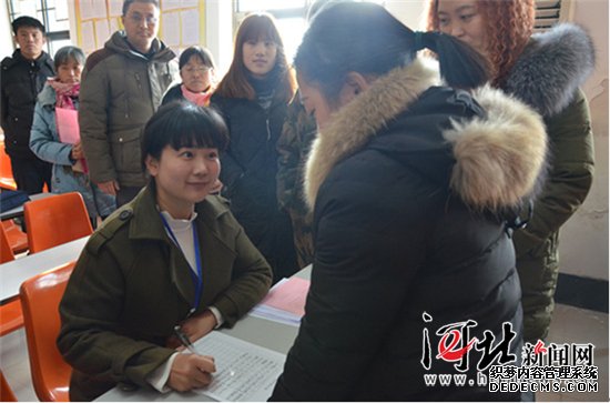 11月23日上午,高邑县万城镇镇直选区选民登记站内,选民排队登记。 镜头二:下了课赶紧来登记 高邑县万城镇约有人口2.4万人,设17个乡人大代表选区和11个县人大代表选区。万城镇人大主席刘晓伟介绍说,该镇以乡人大代表选区为基础,共设置了17个选民登记站,每个选区每个选民登记站至少有3名登记员。 据介绍,11月11日起,万城镇人大就通过悬挂标语、干部入户等方式对县乡人大换届选举工作进行宣传,逢万城镇大集,工作人员还会到集上发放换届选举明白纸,向赶集的老百姓介绍选举知识。 万城镇镇直选区选民登记站就设在万城镇政府院内,主要覆盖镇直各单位和万城学区,在此登记的选民,多是万城学区的教师。上午11时许,前来登记的胡苗苗显得有些匆忙。胡苗苗是一名幼儿园老师,她说:“我是下了课后赶过来登记的,还要赶紧回去,替换别的老师来登记。”