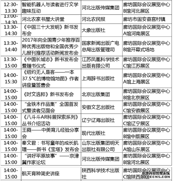 第27届全国图书交易博览会将于5月31日~6月3日在河北廊坊举行。主会场设于廊坊市国际会议展览中心,同时,在唐山市南湖国际会展中心设立分会场,在西柏坡设一个专题展览。 ●注意事项 1.导航的地址会有两个坐标: “廊坊国际会议展览中心”(广阳区)和“国际会展中心”(香河县),在此郑重提醒大家,大家导航时务必输入:廊坊市广阳区祥云道188号的廊坊国际会议展览中心。千万别跑到香河去了。 2.火车出行: ![]() ![]() ![]() 3.开车出行 ![]() ●重要活动 开幕式 时间:2017年5月31日上午9:00-9:30 地点:廊坊国际会议展览中心B馆开幕式场地 唐山会场开幕式 时间:2017年6月1日10:30-11:20 地点:河北省唐山市南湖国际会展中心 西柏坡·优秀党建读物专题展 时间:2017年6月1日9:30-10:00 地点:河北省西柏坡纪念馆广场 盛世书香——燕赵文化展示主题活动 时间:2017年5月30日20:00-21:30 地点:河北廊坊市壹佰剧院 “十大读书人物”揭晓及颁奖活动 时间:2017年5月31日11:20-11:50 地点:河北省廊坊国际会议展览中心B馆开幕式场地 读者大会 时间:2017年5月31日14:30-16:30 地点:河北省廊坊市新绎七修酒店嘉会厅 内容:邀请国内知名学者、作家发表主题演讲,畅谈阅读、分享阅读 纪念新华书店成立80周年主题展 时间:2017年5月31日-6月3日 地点:廊坊国际会议展览中心B馆 2017年向全国青少年推荐百种优秀出版物和全国优秀少儿报刊推荐活动新闻发布会 时间:2017年5月31日13:30-14:40 地点:廊坊国际会议展览中心B馆开幕式场地 ●第27届全国图书交易博览会活动一览表 ![]() ![]() ![]() ![]() ![]() ![]() ![]() ![]() ![]() ![]() ![]() ![]() ![]() ![]() ![]() ![]() ![]() ![]() ![]() ![]() ![]()
